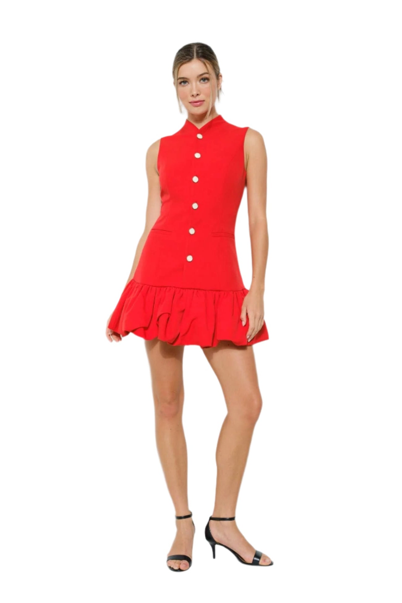 Sleeveless Bubble Hem Buttoned Mini Dress - S / RED está agotado y se enviará tan pronto como vuelva a estar disponible.